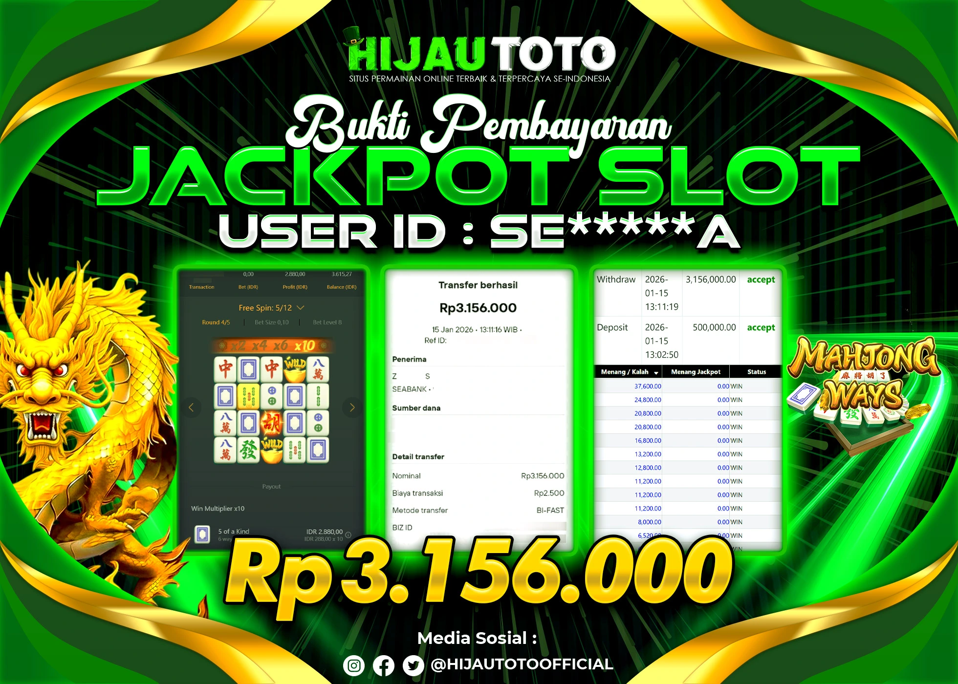 Selamat Kepada Member HIJAUTOTO G*****16 Telah Jackpot Di SLOT MAHJONG WAYS