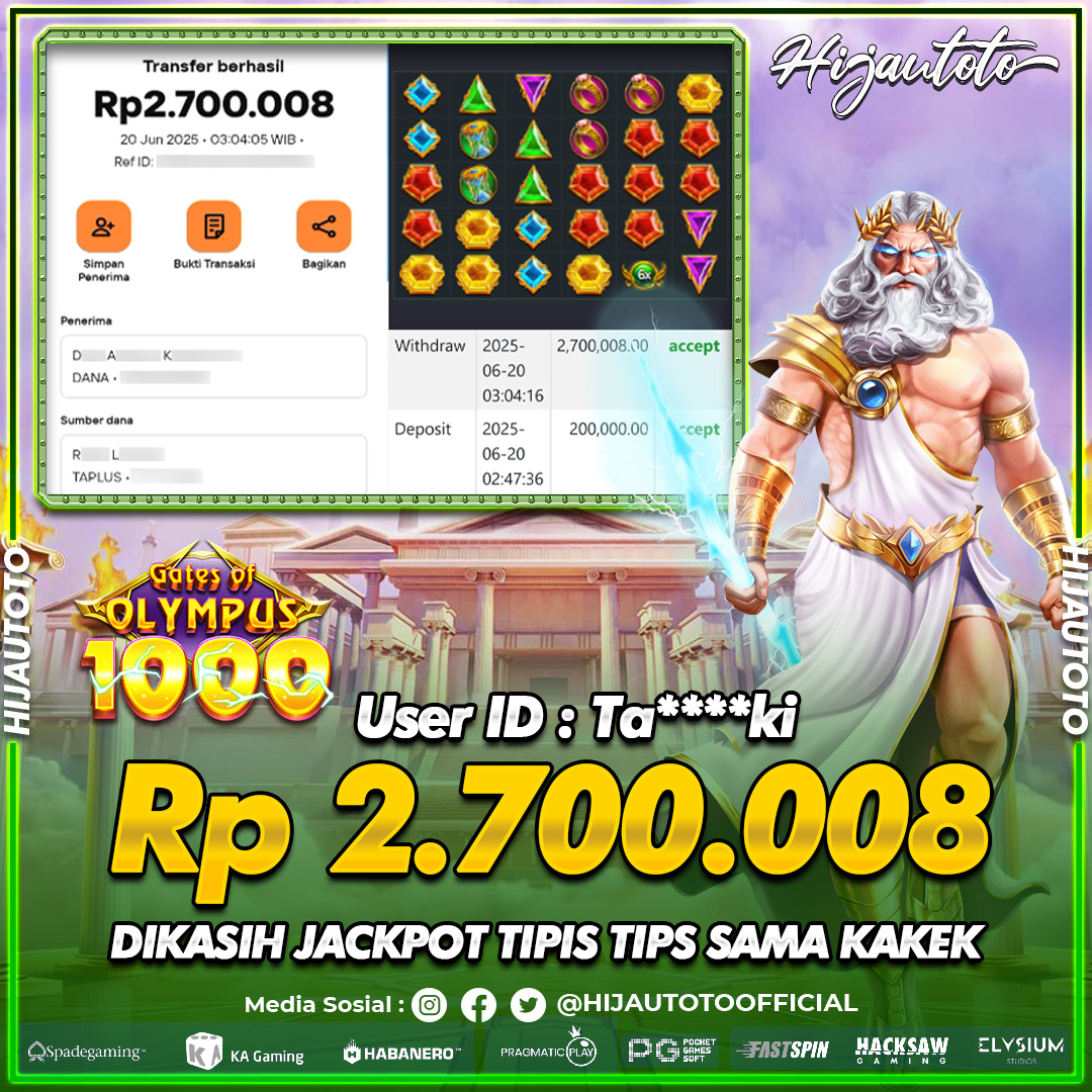 Karena berhasil memenangkan Rp.Rp.2.700.000 dari permainan seru SLOT GATES OF OLYMPUS SUPER SCATTER di HIJAUTOTO! πŸ’°πŸ’Έ